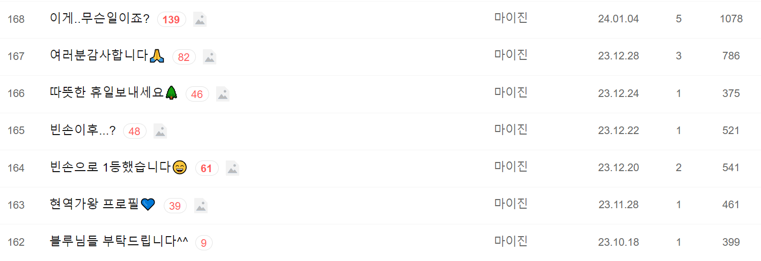 마이진 팬카페에는 실제로 마이진 님께서도 활동하고 있습니다. 아래 사진에서 보시는 바와 같이, 많게는 한달에 4회까지도 팬카페에 와서 팬분들에게 소식을 전하고, 또 감사 인사를 나누는 것을 확인할 수 있습니다.