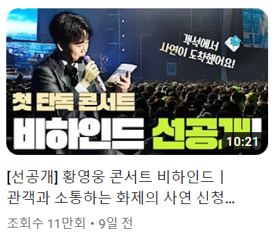 이번 전국 콘서트를 가지 못하신 팬분들께서는 황영웅님 유튜브 채널에서 비하인드 영상들 보시면서 아쉬운 마음을 조금이나마 달래실 수 있길 바랍니다.